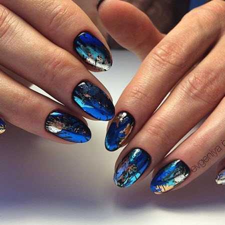 Сусальная фольга — нечто уникальное. Она позволяет создавать неповторимые образы. Главное, освоить технику нанесения, остальное — только ваша фантазия. За основу здесь можно взять любой оттенок лака.