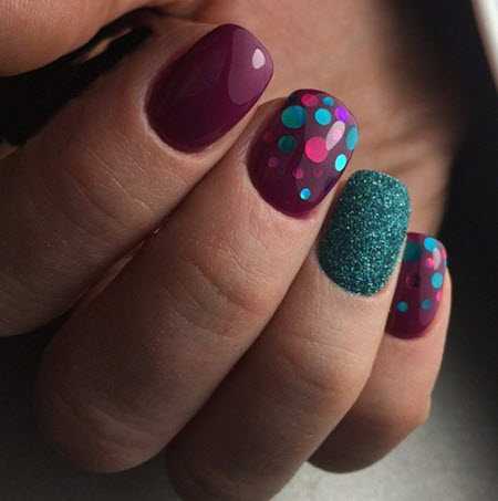 - для более смелого маникюра, с которым не стыдно пойти на какое-то торжество или показаться в учебном заведении, вместо дополнительного цвета можно применять глиттер, бульонки, втирку и т.п.