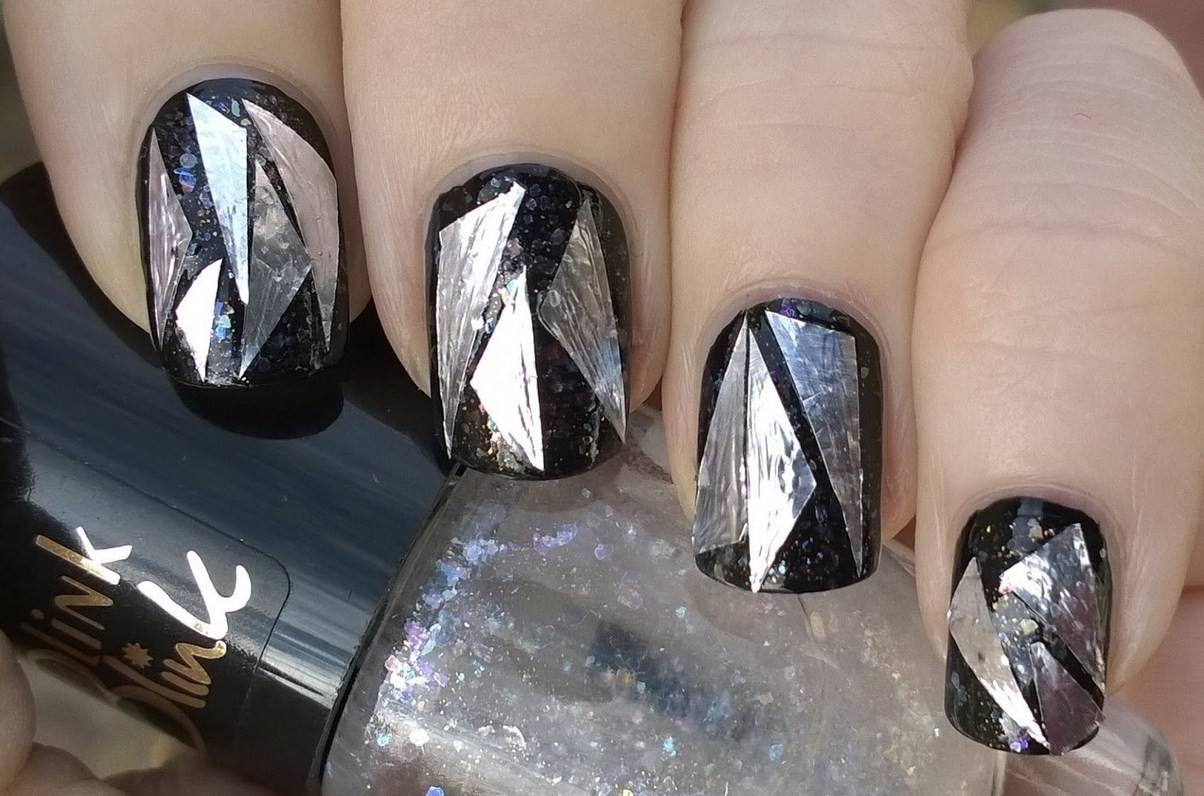 Классическое сочетание черного маникюра – серебристая и золотистая втирка. Но в зависимости от желаемого результата, могут выбираться и другие оттенки. Данный черный маникюр отлично подойдет в качестве вечернего, а если дополнить его дополнительным дизайном, то тематическим праздничным (к примеру, на Хэллоуин, Новый год).