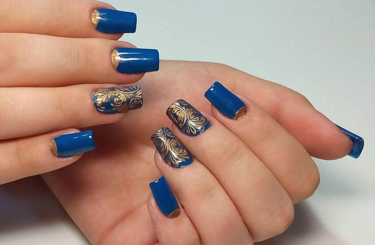 Синий цвет ногтей в сочетании с золотом создает яркий и стильный образ. Это сочетание идеально подойдет для летнего периода, а также для создания образа в стиле морских приключений.