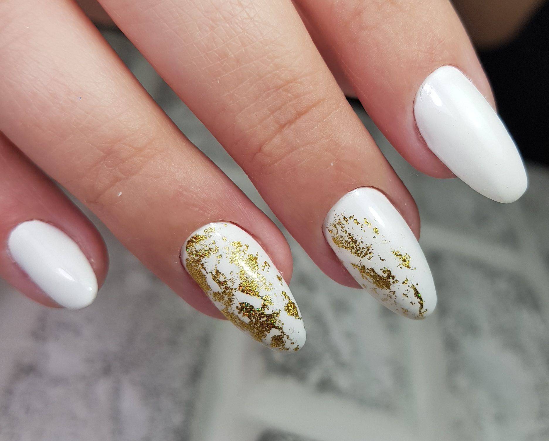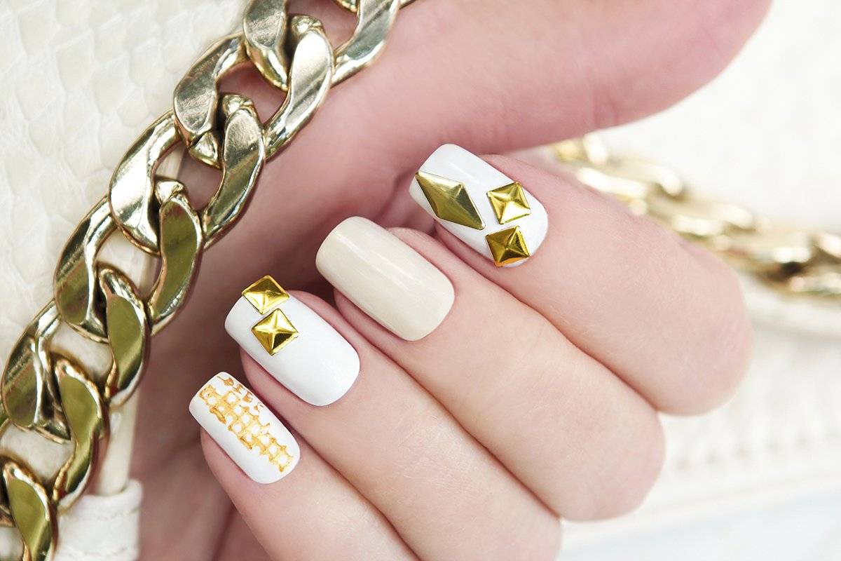 Белый цвет ногтей в сочетании с золотом выглядит очень изысканно и свежо. Это сочетание идеально подойдет для летнего периода, а также для создания свадебного образа.