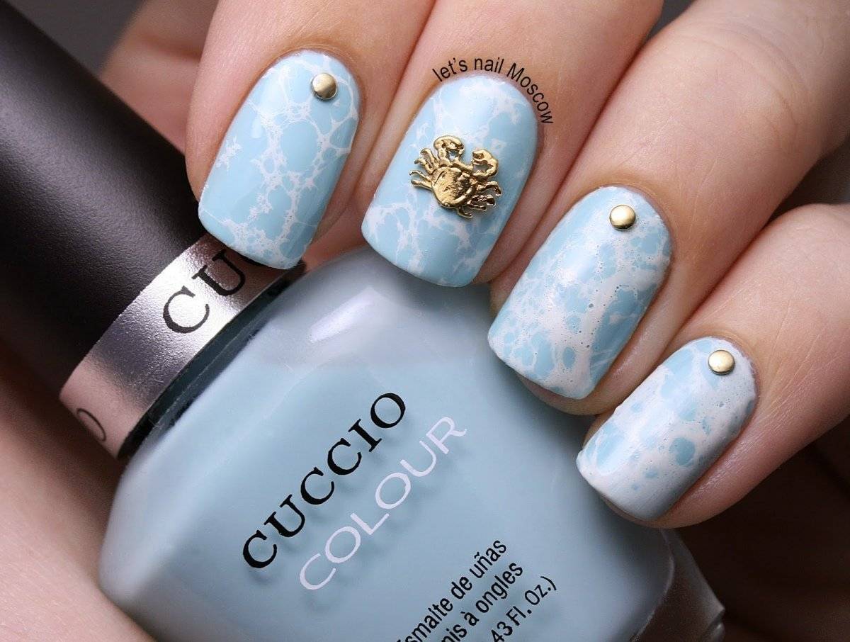 Голубые оттенки ногтей в сочетании с золотом – это очень нежное и изысканное сочетание. Оно идеально подойдет для создания романтичного и нежного образа.