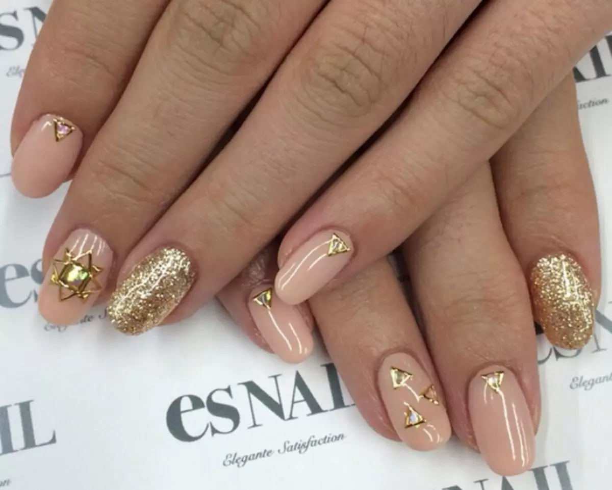 Нюдовые оттенки ногтей в сочетании с золотом создают нежный и женственный образ. Этот стиль идеально подойдет для повседневного использования.