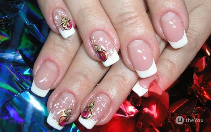 Изображение новогодних огней и мишуры на ногтях – отличное решение для праздничного френча. Лучше всего использовать мелкие рисунку, если хочется оформить таким образом все ногти, либо нанести крупные изображения на 1-2 ногтя на каждой руке. Шары и гирлянды можно нарисовать, можно использовать наклейки или сделать изображение из стразов.