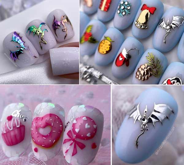 Можно просто найти картинки в магазине и создать новогодний маникюр. Декор как правило включает новогодние рисунки на ногтях в виде картинок.