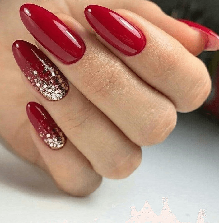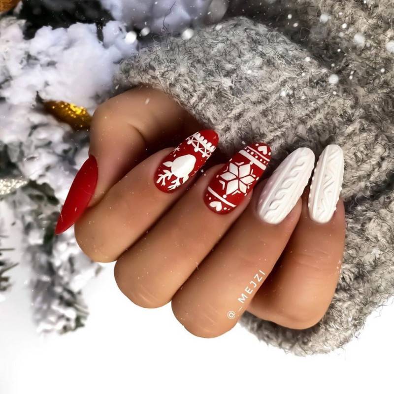 Для любительниц ярких новогодних дизайнов на миндальные ногти, алая палитра — идеальна. Ведь этот цвет сочетается со всеми оттенками:
