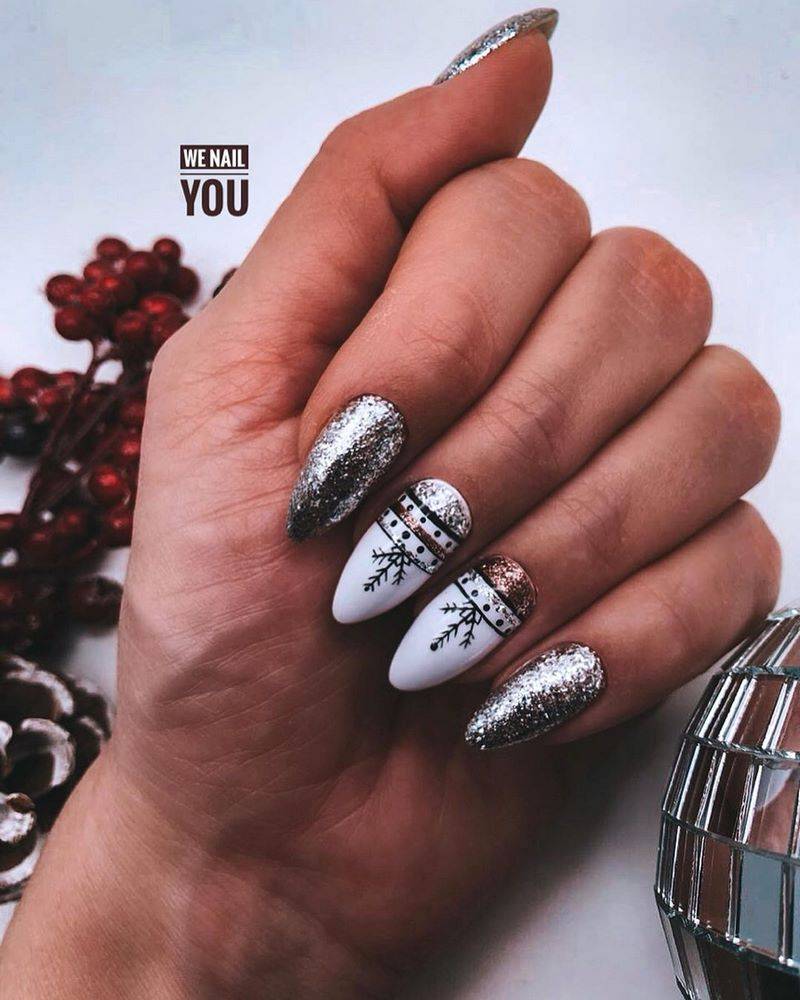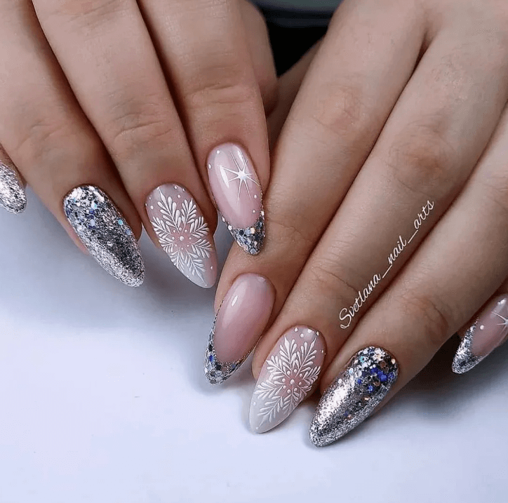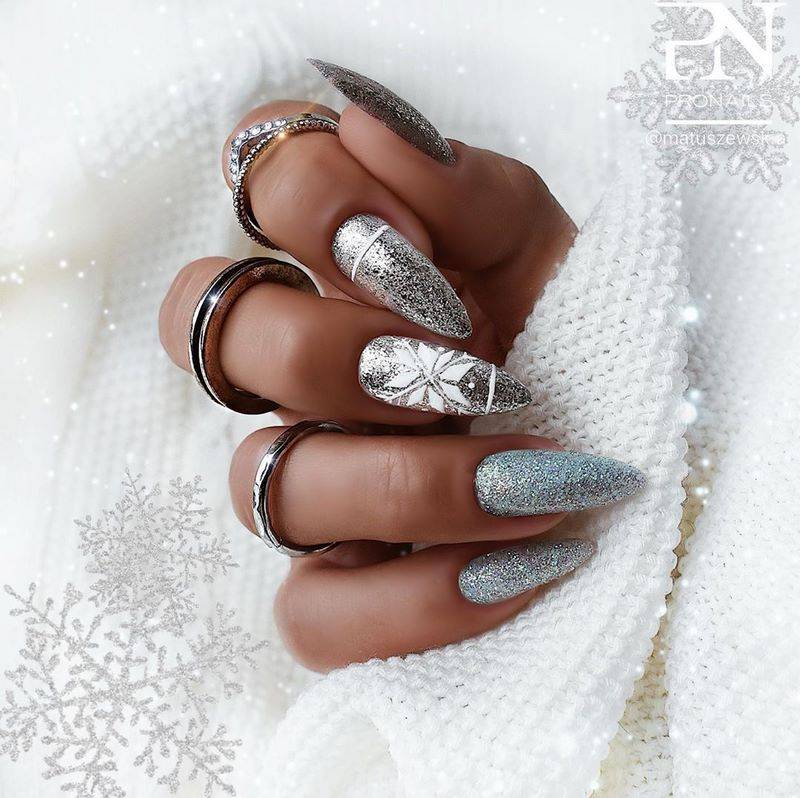 Использование серебристых деталей придаст вашим ногтям элегантность и изысканность, а белый цвет будет символизировать свежесть, чистоту и начало нового года.