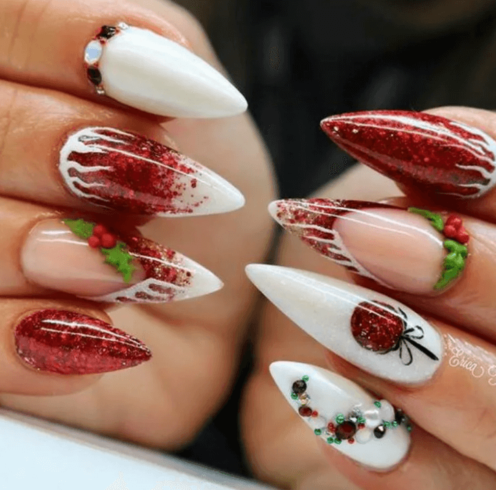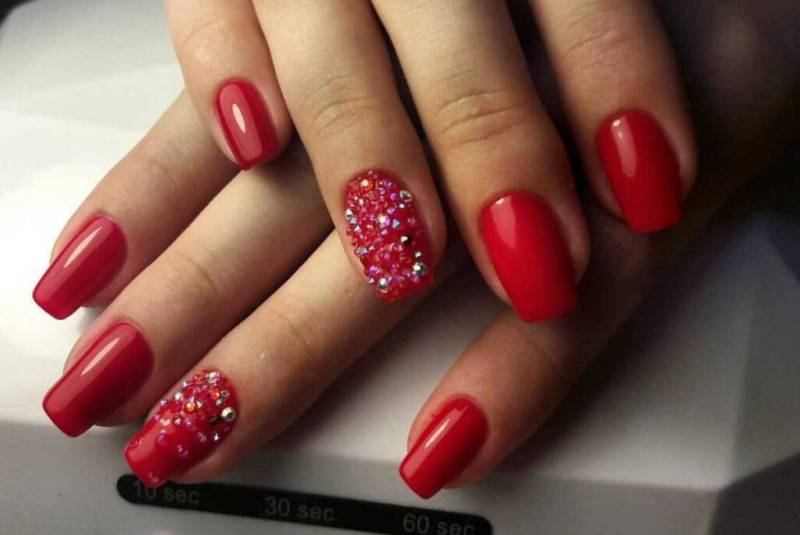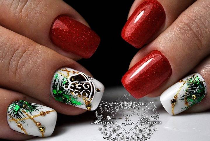Стразы, блестки и другие декоры замечательно подходят к любому сочетанию. Главное помнить о том, что красный — очень яркий и сильный цвет и не переборщить с украшательством. Иначе стильный новогодний маникюр превратиться в безвкусный.