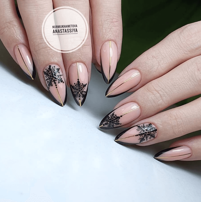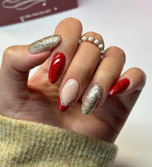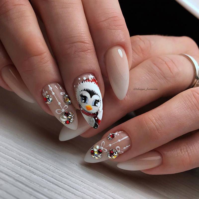 На бежевом фоне можно получить очень эффектный новогодний маникюр. Главное добавить пару ярких акцентов и удачно подобрать дизайн и длину миндаля.