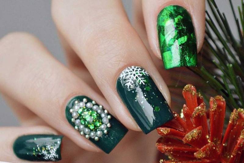 - Сочетание разных декоративных элементов позволит создать уникальный новогодний дизайн ногтей.
