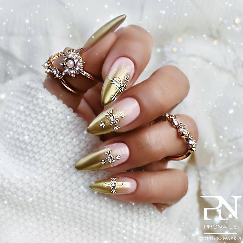 Основной акцент при украшении ногтей лучше делать на фактуры. К примеру, матовые плюс зеркальные. Или, наоборот, поиграть на контрасте и скомбинировать золото и матовые покрытия, блестящие стеклянные или фольгированные украшения.