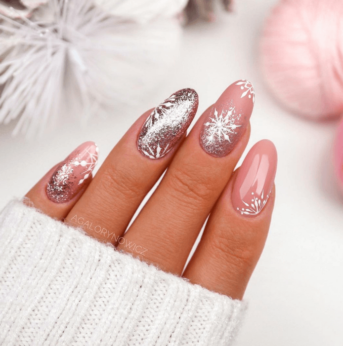Некоторые девушки считают розовый цвет оттенком тепла и весны, но это совсем не так. Этот колер может быть и зимним. Главное использовать приглушенные пудровые тона, они помогут создать нежный новогодний маникюр.