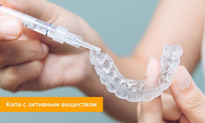 - После этого область зубного ряда, входящая в область улыбки, обрабатывается специальным гелем с перекисью водорода или карбамида;