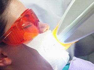 - Для защиты глаз пациент одевает специальные очки. От воздействия УФ-лучей, врач наносит на поверхность слизистый слой полости рта, щеки, губы специальный крем. Также выполняется фиксирование губ ретрактором;